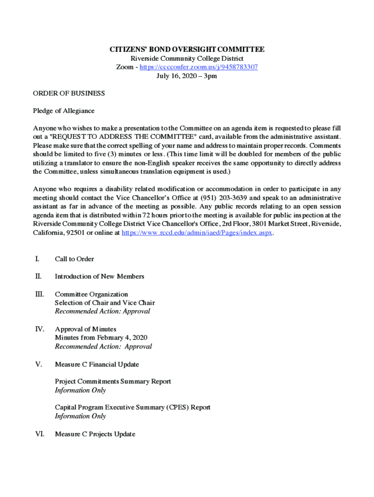 CITIZENS BOND OVERSIGHT COMMITTEE Riverside Community College District Zoom https://cccconfer.zoom.us/j/9458783307 July 16, 2020 3pm ORDER OF BUSINESS Pledge of Allegiance Anyone who wishes to make
