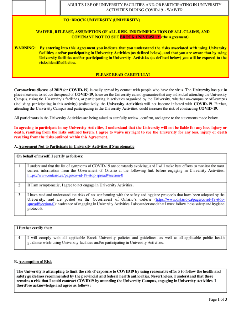 ADULT\'S USE OF UNIVERSITY FACILITIES ARDOR PARTICIPATING IN UNIVERSITY ACTIVITIES DURING COVID-19 WAIVER TO: BROCK UNIVERSITY (UNIVERSITY) WAIVER, RELEASE, ASSUMPTION OF ALL RISK, INDEMNIFICATION
