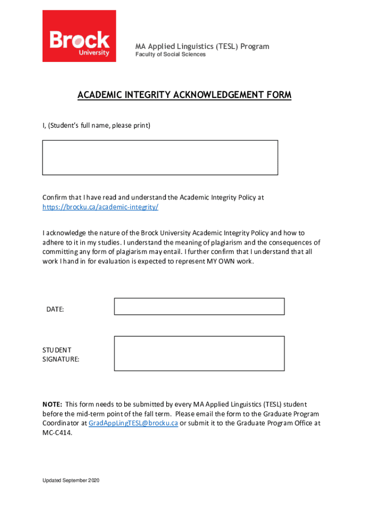 MA Applied Linguistics (TESL) Program Faculty of Social SciencesACADEMIC INTEGRITY ACKNOWLEDGEMENT FORM I, (Students full name, please print)Confirm that I have read and understand the Academic Integrity