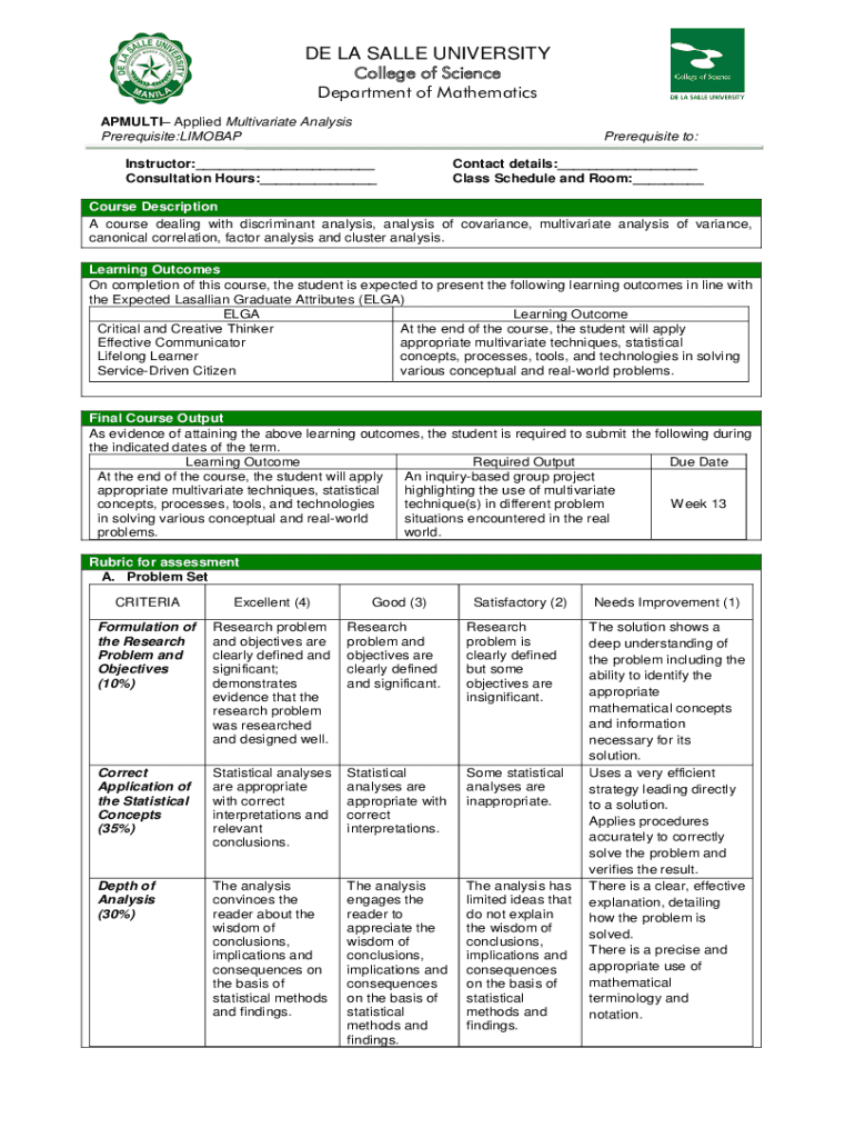 DE LA SALE UNIVERSITY College of Science Department of Mathematics MULTI Applied Multivariate Analysis Prerequisite:LIMOBAPPrerequisite to:Instructor:___ Consultation Hours:___Contact details:___