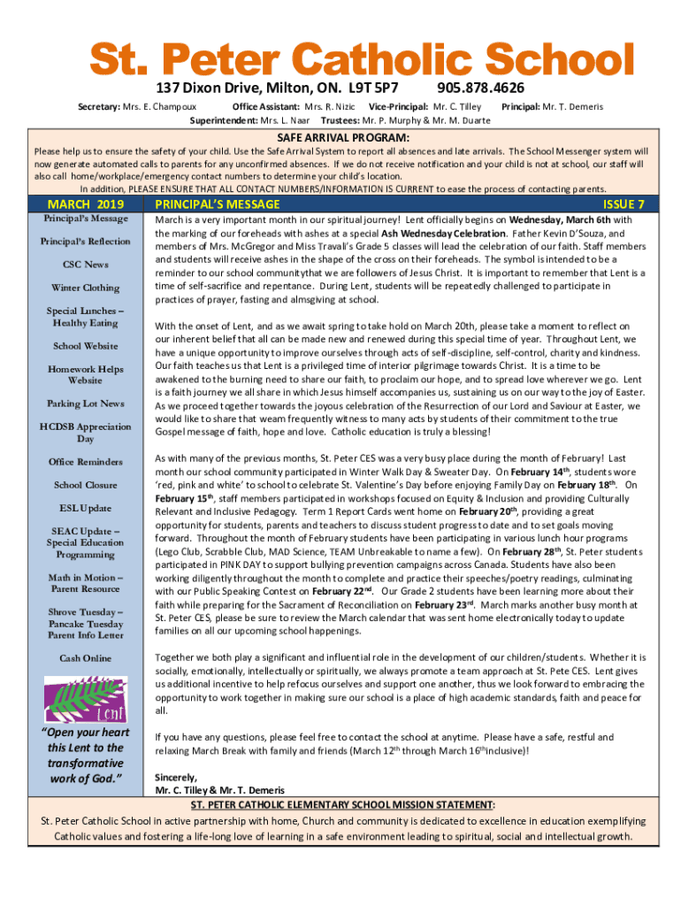 St. Peter Catholic School 137 Dixon Drive, Milton, ON. L9T 5P7905.878.4626Secretary: Mrs. E. Campout Office Assistant: Mrs. R. Nazi VicePrincipal: Mr. C. Villa Superintendent: Mrs. L. Near Trustees: