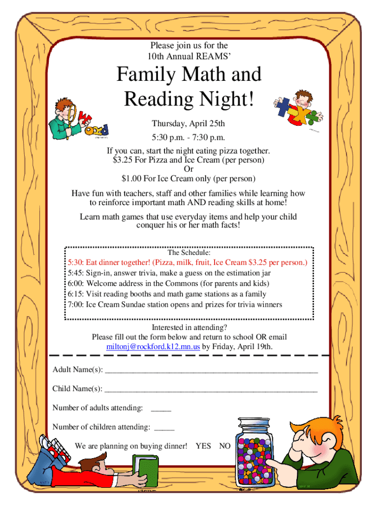Please join us for the 10th Annual REAMSFamily Math and Reading Night! Thursday, April 25th 5:30 p.m. 7:30 p.m. If you can, start the night eating pizza together. $3.25 For Pizza and Ice Cream (per