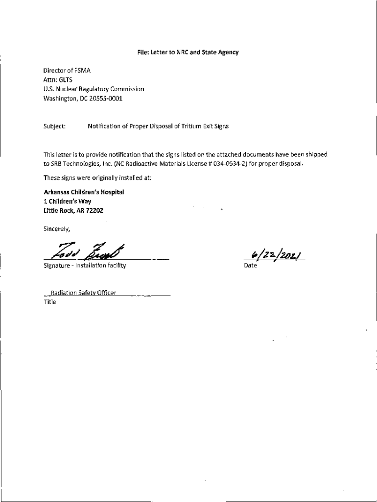 File: Letter to NRC and State AgencyDirector of FSMA Attn: GETS U.S. Nuclear Regulatory Commission Washington, DC 205550001Subject:Notification of Proper Disposal of Tritium Exit Signets letter is