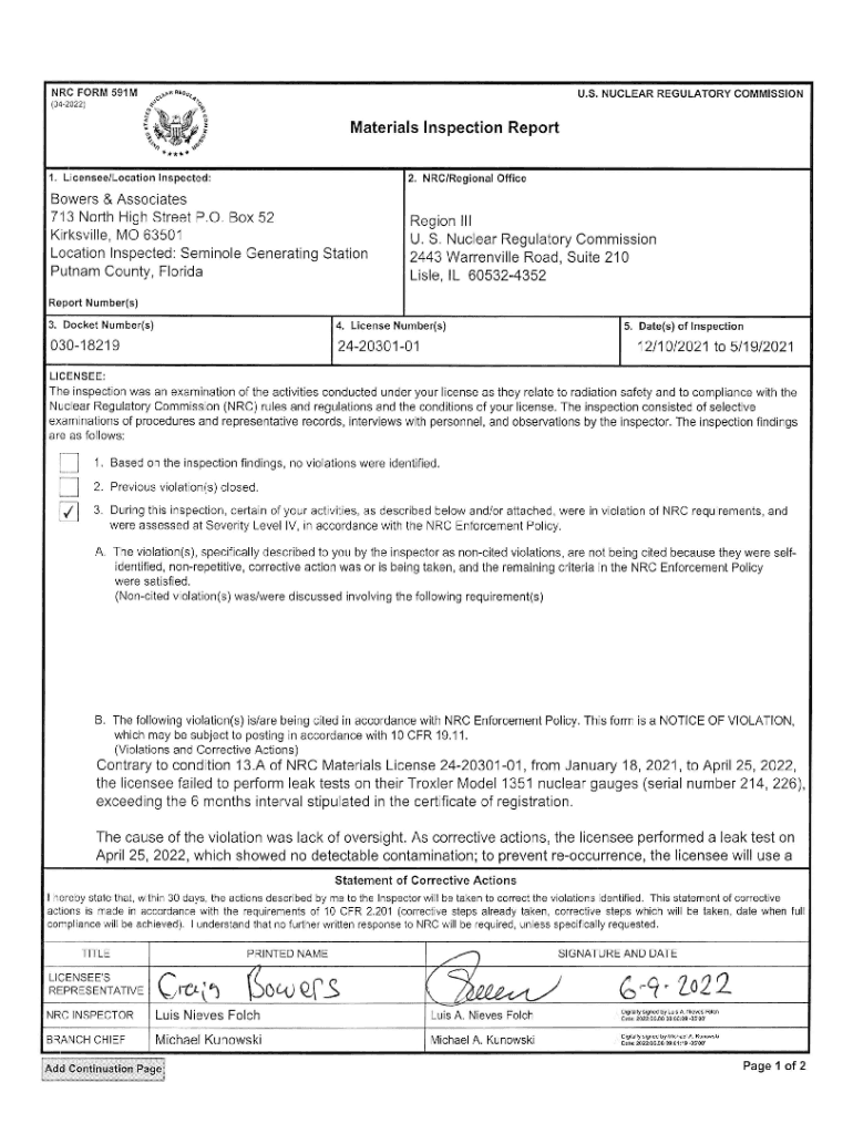 Get the free Bowers & Associates, NRC Form 591M, Inspection Report ...