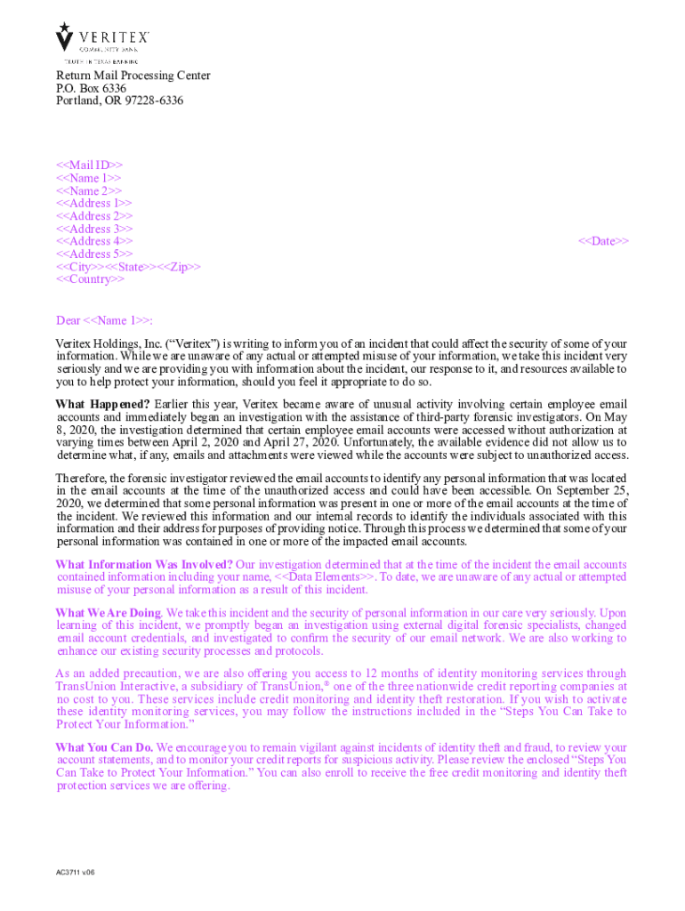 Return Mail Processing Center P.O. Box 6336 Portland, OR 972286336Mail ID Name 1 Name 2 Address 1 Address 2 Address 3 Address 4Address 5 CityStateZip CountryDateDear Name 1: Vertex Holdings, Inc.