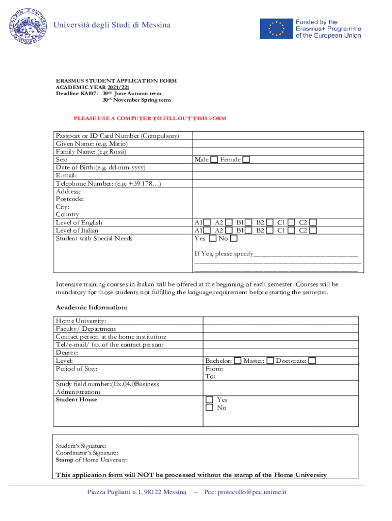 University deli Studio di MessinaERASMUS STUDENT APPLICATION FORM ACADEMIC YEAR 2021/221 Deadline KA107: 30th June Autumn term 30th November Spring term PLEASE USE A COMPUTER TO FILL OUT THIS FORMPassport