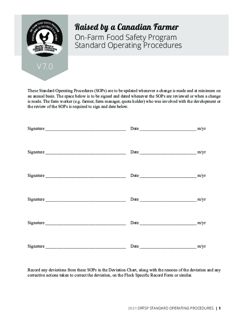 Raised by a Canadian FarmerOnFarm Food Safety Program Standard Operating ProceduresV7.0 These Standard Operating Procedures (SOPs) are to be updated whenever a change is made and at minimum on an