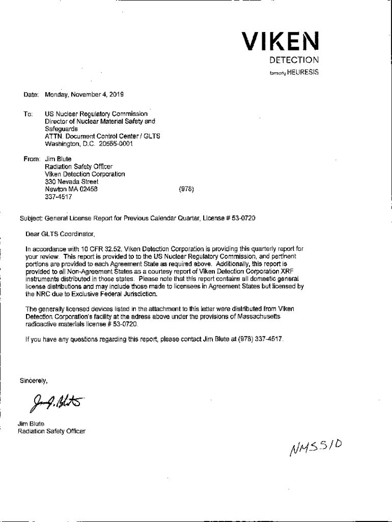 AIKEN DETECTION formerlyDate:Monday, November 4, 2019To:US Nuclear Regulatory Commission Director of Nuclear Material Safety and Safeguards ATTN. Document Control Center I GETS Washington, D.C. 205550001From: