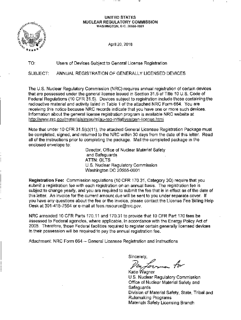 UNITED ST DATES NUCLEAR REGULATORY COMMISSION WASHINGTON, D.C. 205550001April 20, 2018TO:Users of Devices Subject to General License RegistrationSUBJECT:ANNUAL REGISTRATION OF GENERALLY LICENSED Devices