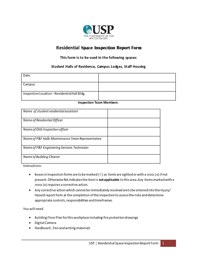 Residential Space Inspection Report Form This form is to be used in the following spaces: Student Halls of Residence, Campus Lodges, Staff Housing Date Campus Inspection Location Residential Hall