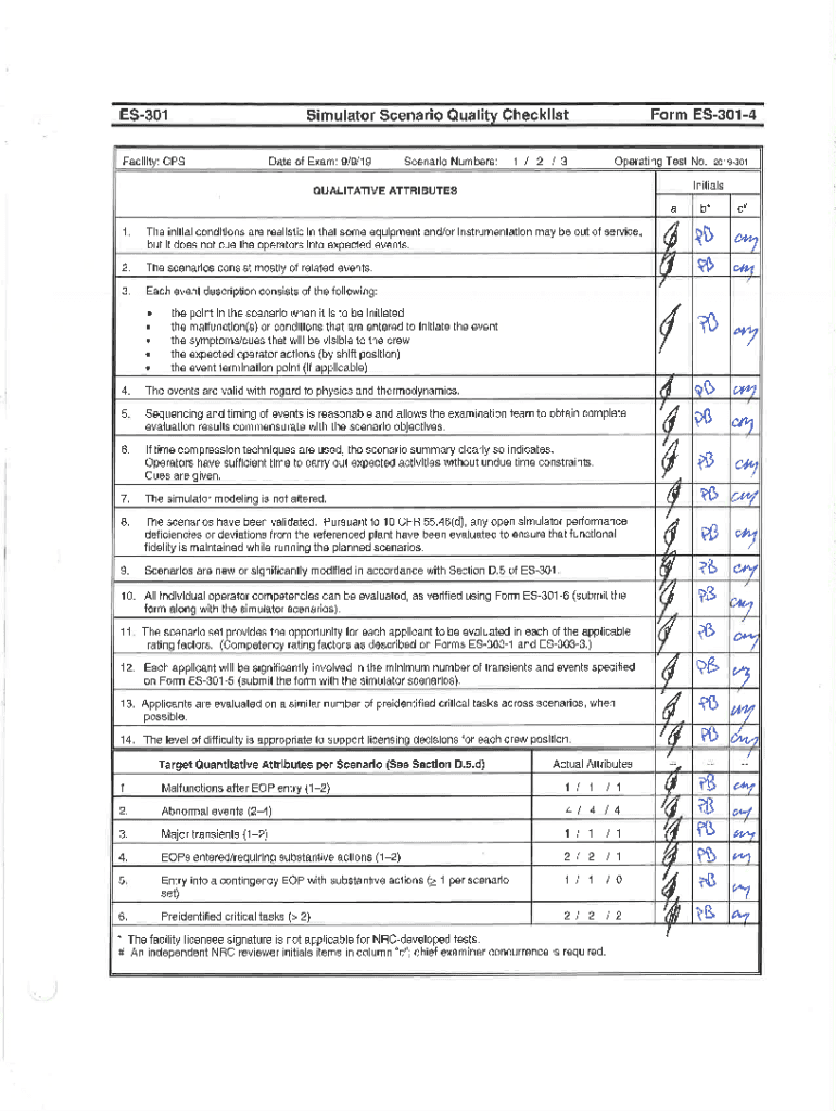 Form ES3014Simulator Scenario Quality ChecklistES301Date of Exam:Facility: CPS9/9/19Scenario Numbers: 1I 2I3Operating Test No.: zorssorlnitialsOUALITATIVE ATTRIBUTES the initial conditions are realistic