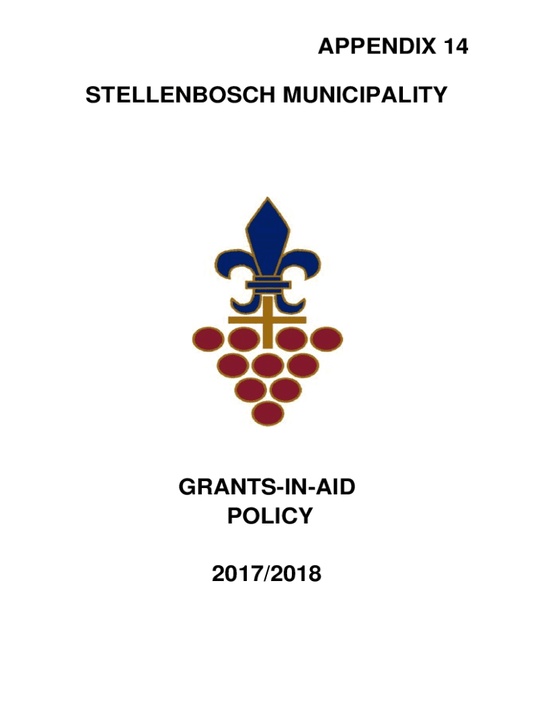 APPENDIX 14 STELLENBOSCH MUNICIPALITYGRANTSINAID POLICY 2017/2018STELLENBOSCH MUNICIPALITY GRANTSINAID POLICY TABLE OF CONTENTS PAGE1.DEFINITIONS................................................................................................................................32.PURPOSE,