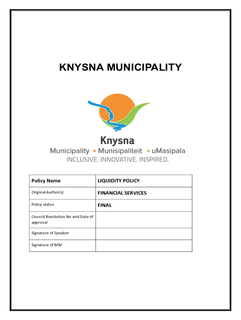 KṚṢṆA MUNICIPALITYPolicy NameLIQUIDITY POLICYOriginal Author(s)FINANCIAL SERVICESPolicy statusFINALCouncil Resolution Now and Date of