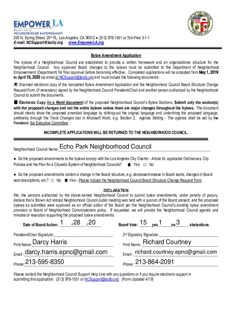 200 N. Spring Street, 20th FL, Los Angeles, CA 90012 (213) 9781551 or Toll-free 311 Email: NCSupport@lacity.org www.EmpowerLA.org Bylaw Amendment Application The bylaws of a Neighborhood Council are