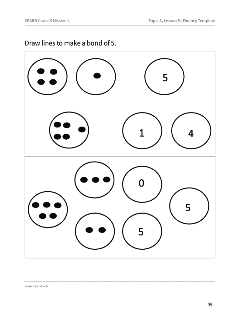 LEARN Grade K Mission 4Topic A, Lesson 5 | Fluency TemplateDraw lines to make a bond of 5.make a bond of 556ZEARN Grade K Mission 4Topic B, Lesson 10 | Optional Problem Recolor some faces orange and