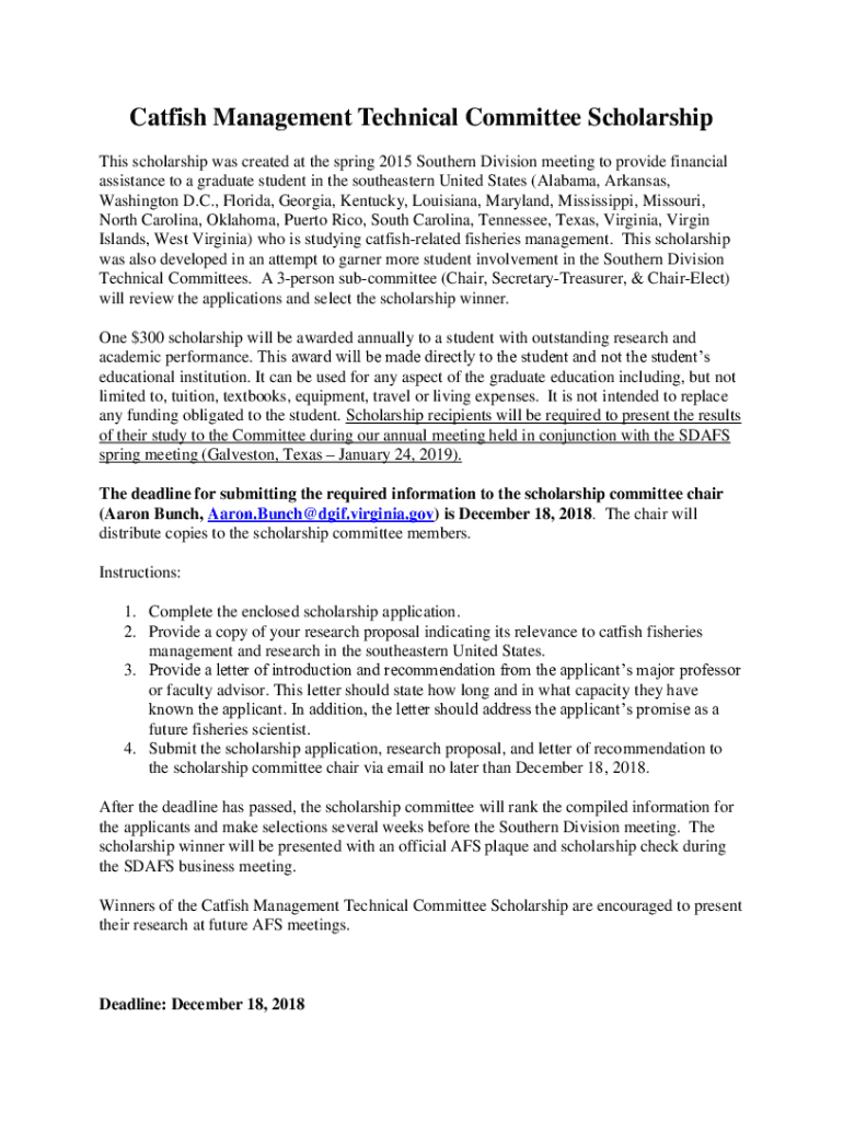Catfish Management Technical Committee Scholarship This scholarship was created at the spring 2015 Southern Division meeting to provide financial assistance to a graduate student in the southeastern