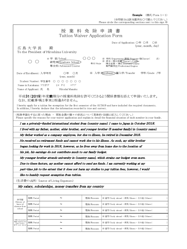 Example(/Form Please circle the corresponding sections next to this sign Tuition Waiver Application Form Date of Application: (year, month, day) To the President of Hiroshima University/School /Graduate