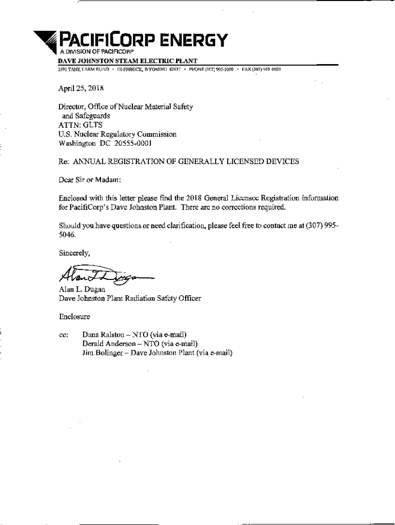 DAVE JOHNSTON STEAM ELECTRIC PLANT 1591 TANK FARM ROAD BEDROCK, WYOMING 82637 PHONE (307) 9955000 FAX (307) 9955020April 25, 2018 Director, Office of Nuclear Material Safety and Safeguards ATTN:GETS