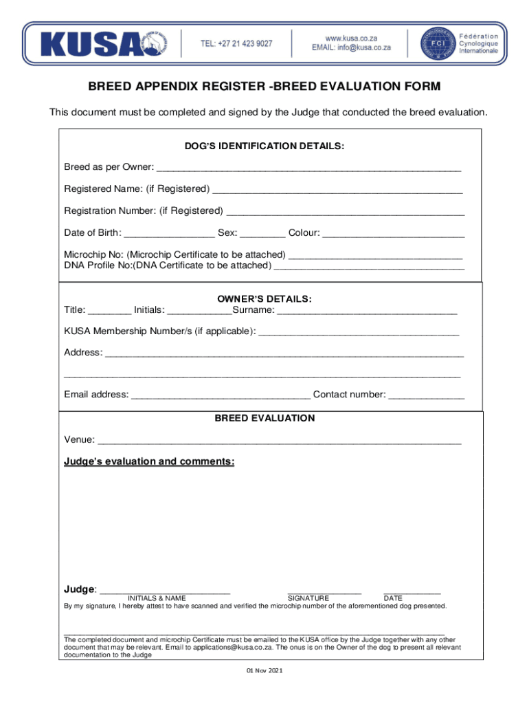 Get the free Breed Evaluation Form (Appendix Registers) - kusa.co.za