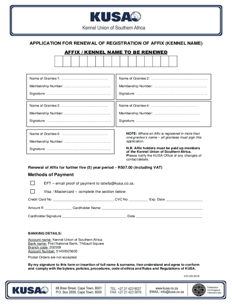 APPLICATION FOR RENEWAL OF REGISTRATION OF AFFIX (KENNEL NAME) AFFIX / KENNEL NAME TO BE RENEWEDName of Grantee 1:. Name of Grantee 2:. Membership Number:. Membership Number:. Signature:. Signature:.
