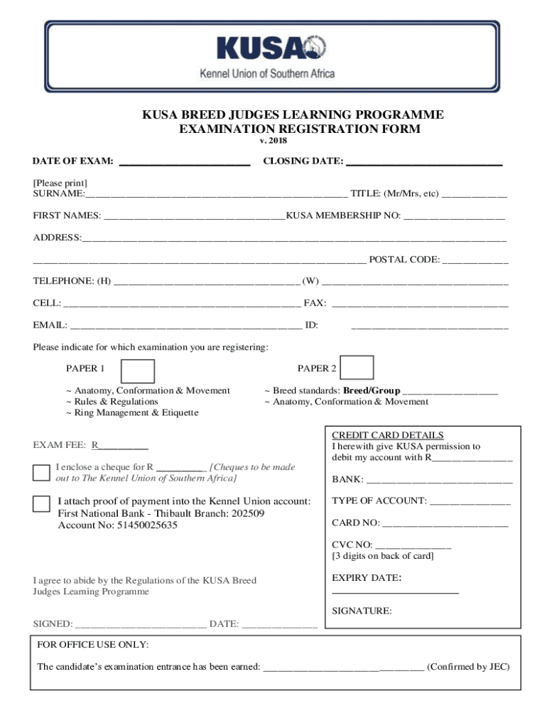 USA BREED JUDGES LEARNING Program EXAMINATION REGISTRATION FORM v. 2018DATE OF EXAM: ___CLOSING DATE: ___[Please print] SURNAME:___ TITLE: (Mr/Mrs, etc) ___ FIRST NAMES: ___USA MEMBERSHIP NO: ___