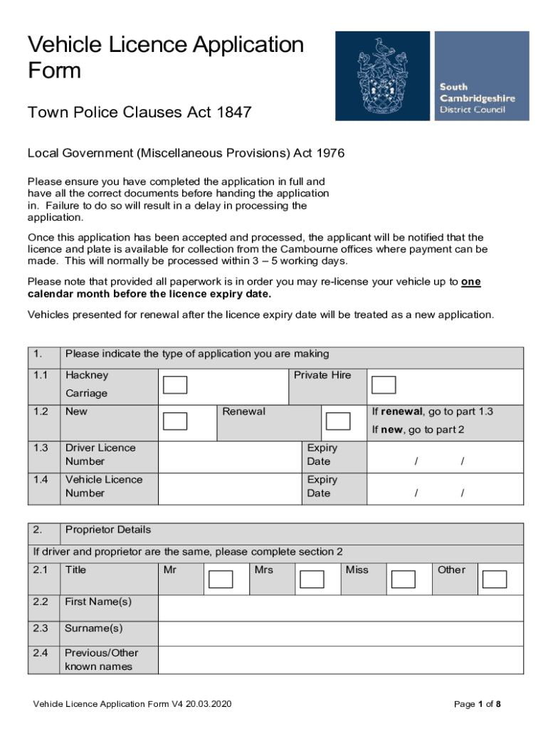 Vehicle License Application Form Town Police Clauses Act 1847 Local Government (Miscellaneous Provisions) Act 1976 Please ensure you have completed the application in full and have all the correct