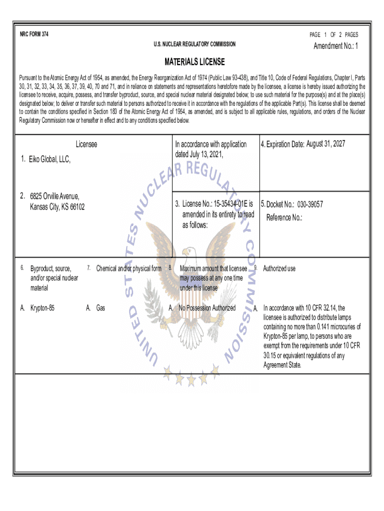 NRC FORM 374PAGE U.S. NUCLEAR REGULATORY COMMISSION1OF 2 PAGESAmendment No.: 1MATERIALS LICENSE Pursuant to the Atomic Energy Act of 1954, as amended, the Energy Reorganization Act of 1974 (Public