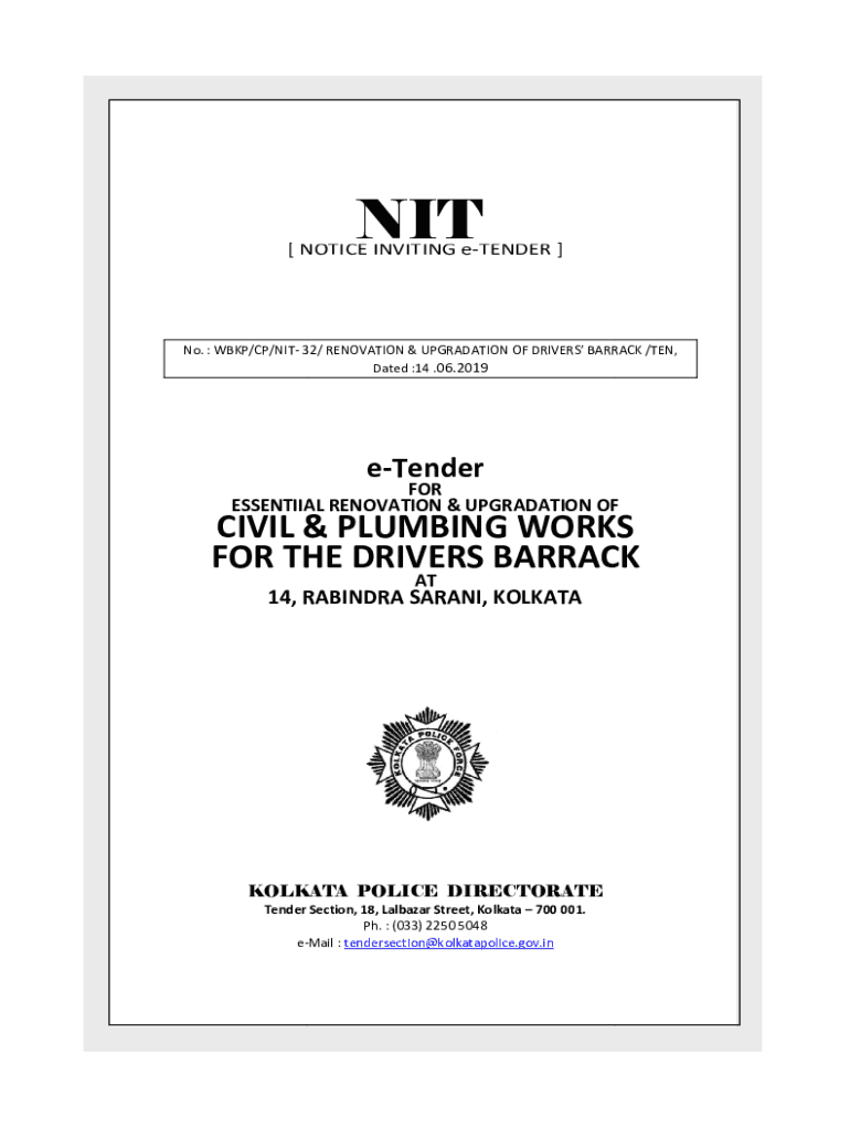 Notice Inviting eTenderPage|1NIT [NOTICE INVITING tender e]No. BKP/CP/NIT 32/ RENOVATION & Upgrade OF DRIVERS RIVERS BARRACK /TEN, Dated :14 .06.2019eTenderFOR ESSENTIAL RENOVATION & Upgrade CIVIL