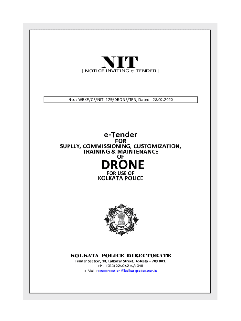 Notice Inviting eTenderPage|1NIT [NOTICE INVITING tender e]No. BKP/CP/NITWIT/CP/NIT 129/DRONE/TEN, Dated : 28.02.2020eTenderFOR SUPPLY, COMMISSIONING, COMMISSIONING, CUSTOMIZATION, TRAINING & MAINTENANCE