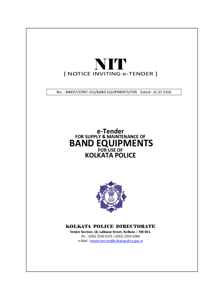 P a GE |1Notice Inviting tenderest [NOTICE INVITING tender]No. BKP/CP/NIT102/BAND EQUIPMENTS/TEN Dated : 31.07.2018eTenderFOR SUPPLY & MAINTENANCE BAND EQUIPMENTS FOR USE KOLKATA POLICEKOLKATA POLICE