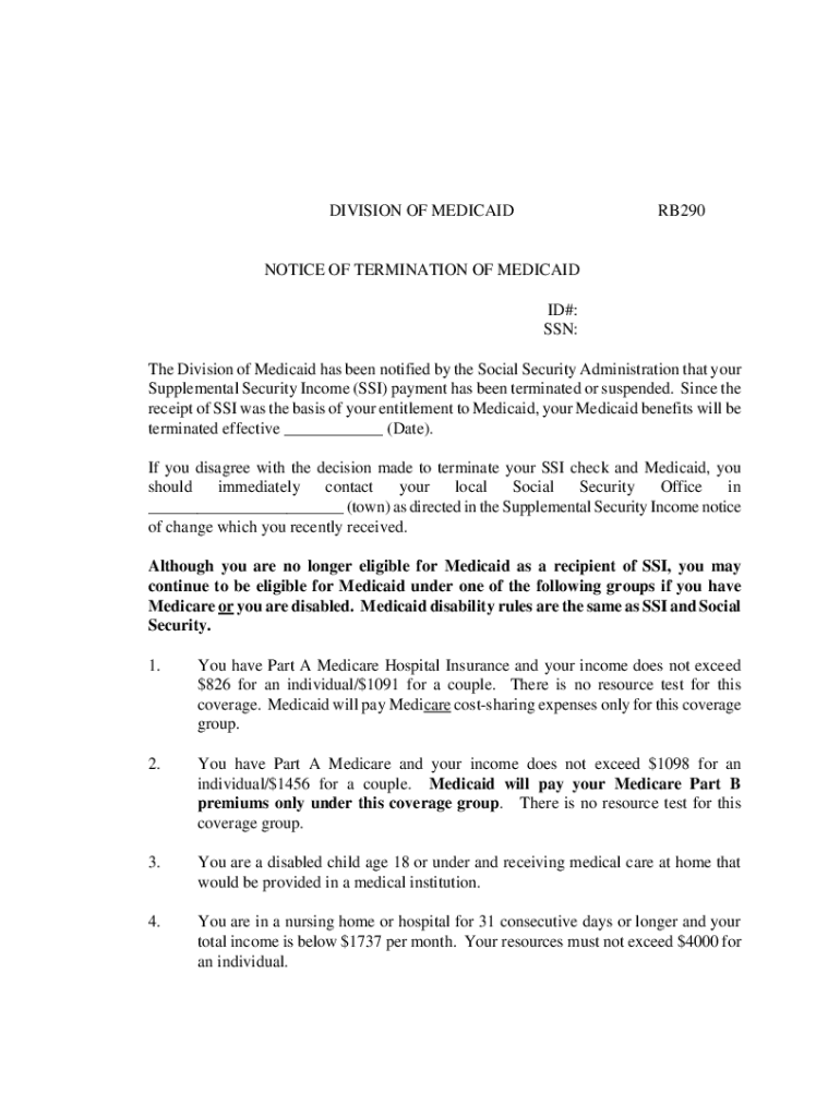 DIVISION OF MEDICAIDRB290NOTICE OF TERMINATION OF MEDICAID ID#: SSN: The Division of Medicaid has been notified by the Social Security Administration that your Supplemental Security Income (SSI) payment