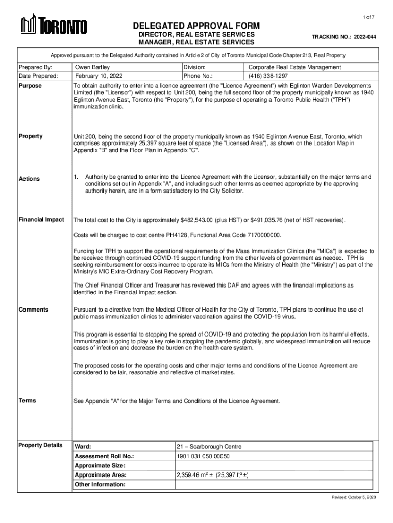 1 of 7DELEGATED APPROVAL FORM DIRECTOR, REAL ESTATE SERVICES MANAGER, REAL ESTATE SERVICESTRACKING NO.: 2022044Approved pursuant to the Delegated Authority contained in Article 2 of City of Toronto