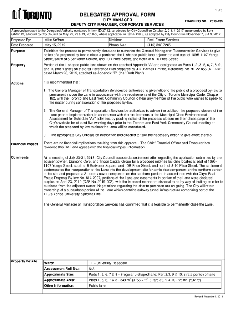 1 of 5DELEGATED APPROVAL FORM CITY MANAGER DEPUTY CITY MANAGER, CORPORATE SERVICESTRACKING NO.: 2019133Approved pursuant to the Delegated Authority contained in Item EX27.12, as adopted by City Council