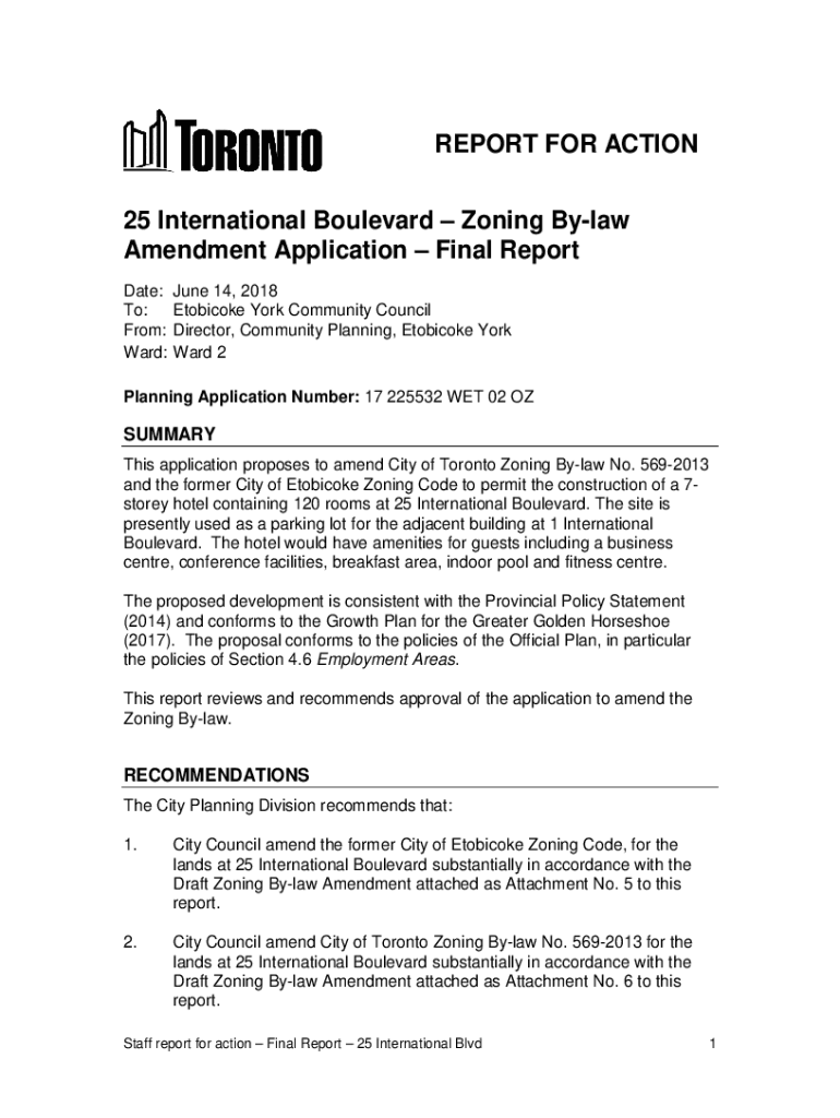 REPORT FOR ACTION 25 International Boulevard Zoning Bylaw Amendment Application Final Report Date: To: From: Ward:June 14, 2018, Etobicoke York Community Council Director, Community Planning, Etobicoke