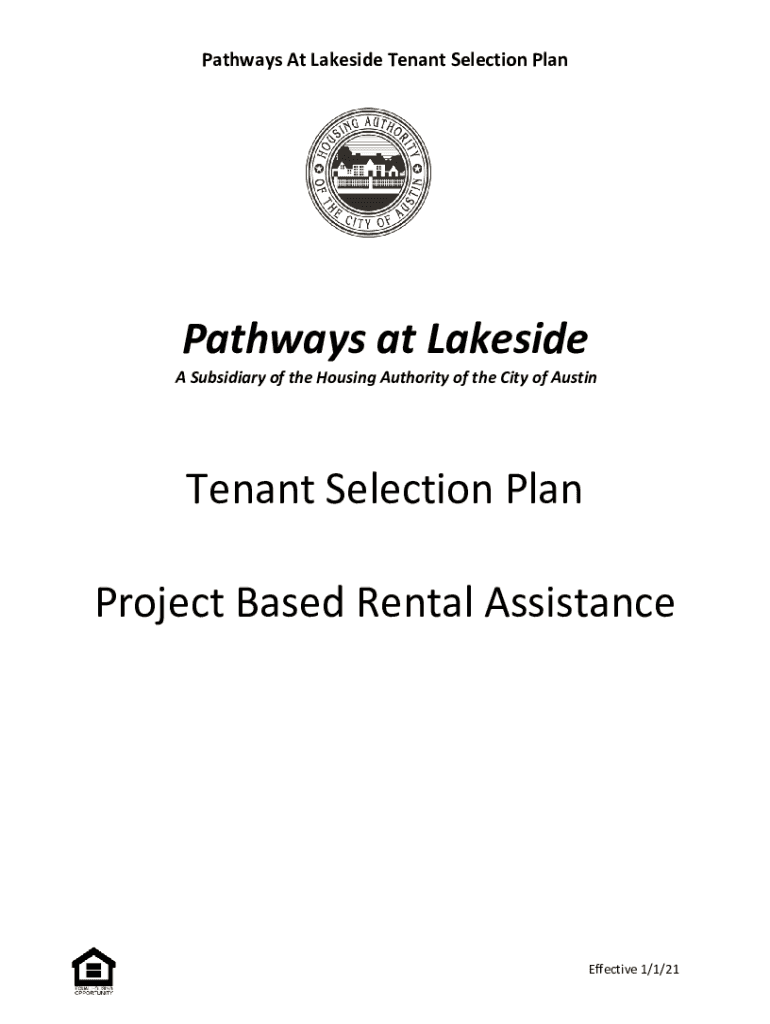 Pathways At Lakeside Tenant Selection PlanPathways at Lakeside Subsidiary of the Housing Authority of the City of AustinTenant Selection Plan Project Based Rental AssistanceEffective 1/1/21Pathways