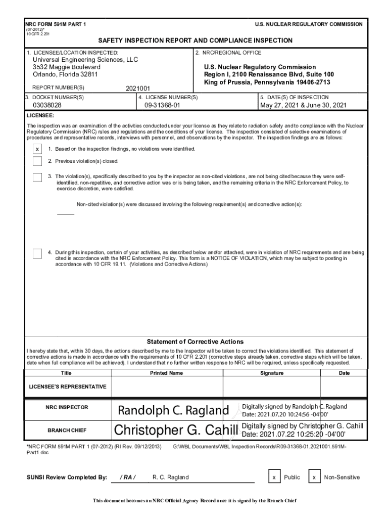 Get the free Universal Engineering Sciences, LLC., NRC Form 591M Part 1, Inspection Report No. 03...