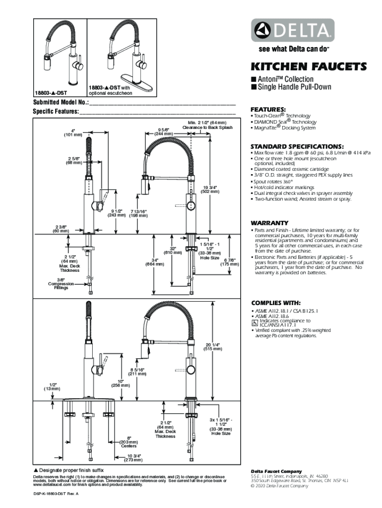 KITCHEN FAUCETS 18803DST Antoni Collection Single Handle PullDown18803DST with optional escutcheonSubmitted Model No.:___ Specific Features:___ 9 5/8\” (244 mm)4\” (101 mm)Min. 2 1/2\” (64 mm)