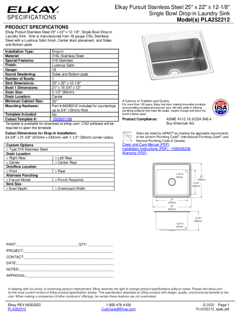 Elway Pursuit Stainless Steel 25\” x 22\” x 121/8\” Single Bowl Drop in Laundry Sink Model(s) PLA252212SPECIFICATIONS PRODUCT SPECIFICATIONS Elway Pursuit Stainless Steel 25\” x 22\” x 121/8\”,