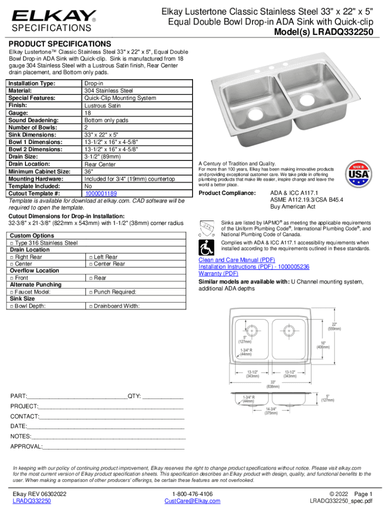 SPECIFICATIONSElkay Luster tone Classic Stainless Steel 33\” x 22\” x 5\” Equal Double Bowl Drop in ADA Sink with Quick clip Model(s) LRADQ332250PRODUCT SPECIFICATIONS Elway Luster tone Classic