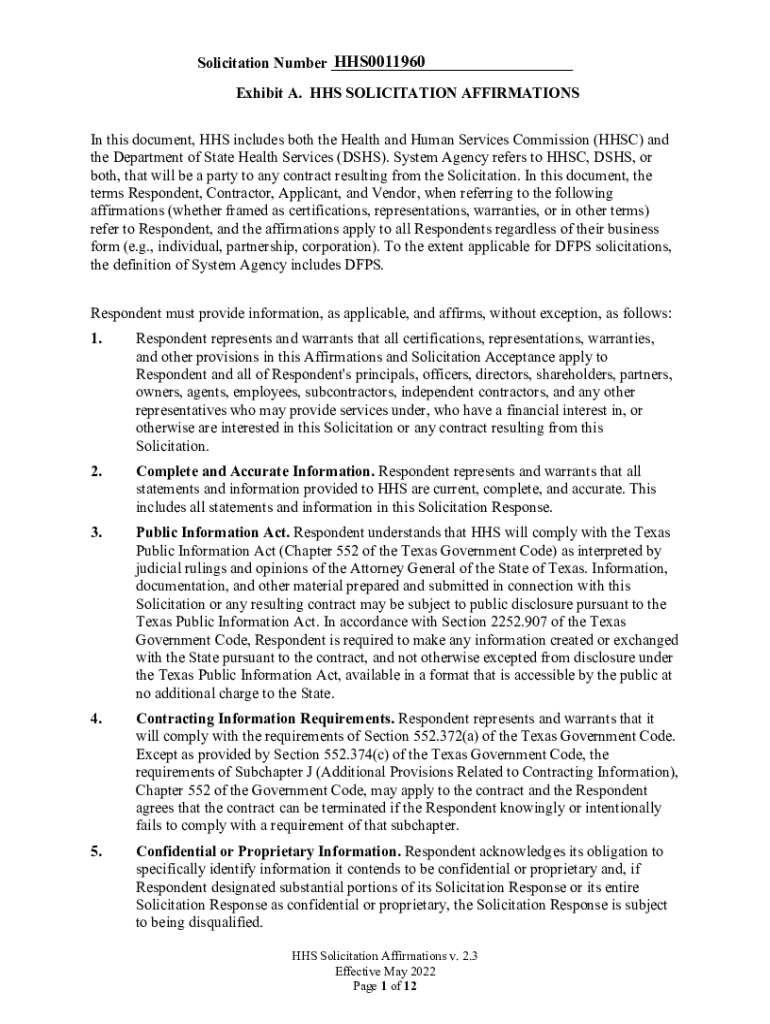 HHS0011960 Solicitation Number ___ Exhibit A. HHS SOLICITATION AFFIRMATIONS In this document, HHS includes both the Health and Human Services Commission (HHSC) and the Department of State Health Services