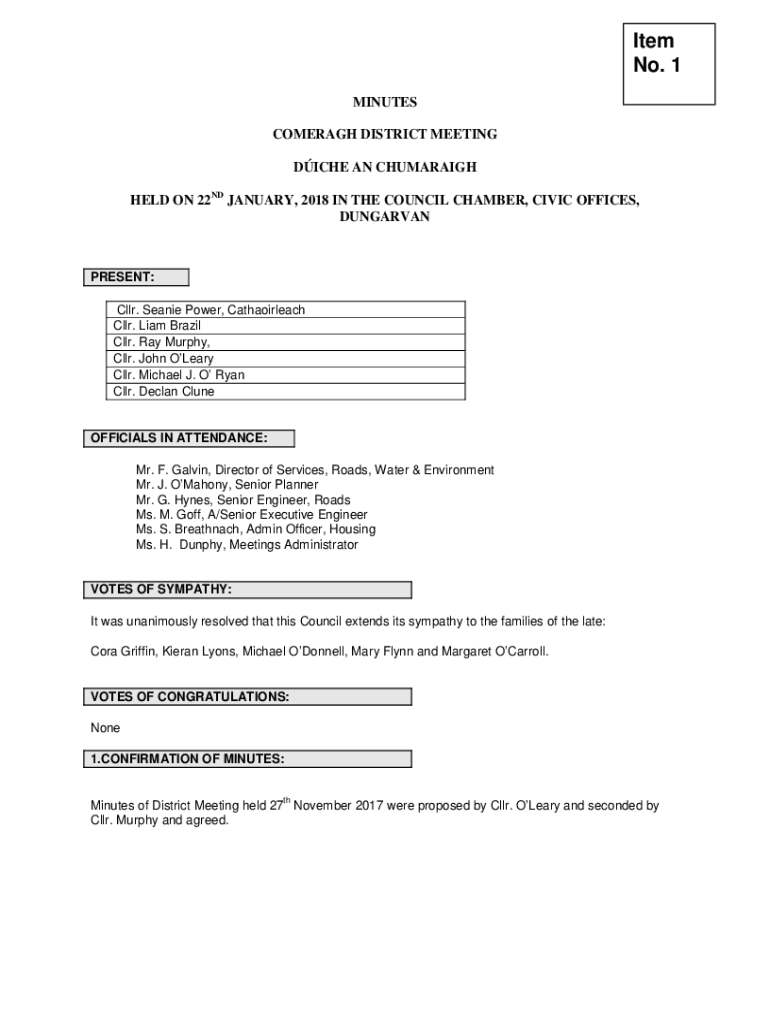 Item No. 1 MINUTES COMER AGH DISTRICT MEETING DICE AN CHUMARAIGH HELD ON 22ND JANUARY 2018 IN THE COUNCIL CHAMBER, CIVIC OFFICES, DUNGARVANPRESENT: CLR. Jeanie Power, Cathaoirleach CLR. Liam Brazil