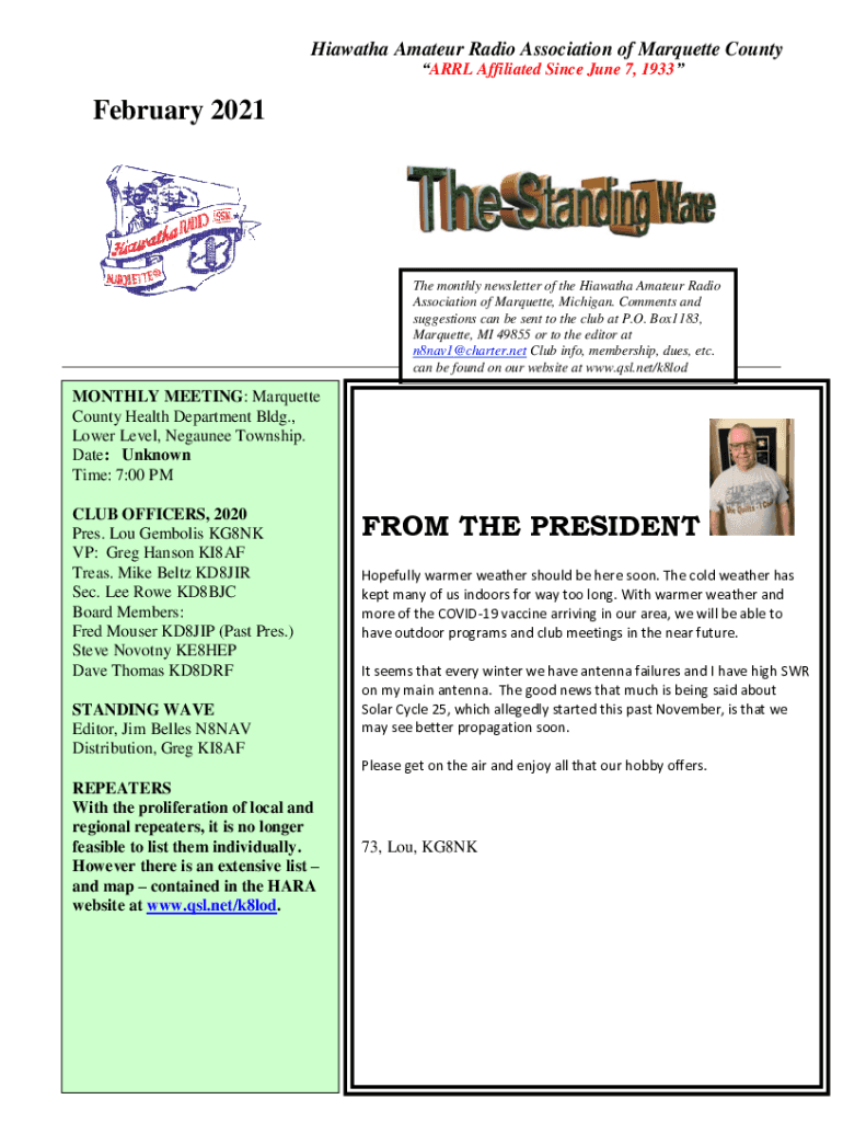 Hiawatha Amateur Radio Association of Marquette County ARL Affiliated Since June 7, 1933February 2021The monthly newsletter of the Hiawatha Amateur Radio Association of Marquette, Michigan. Comments