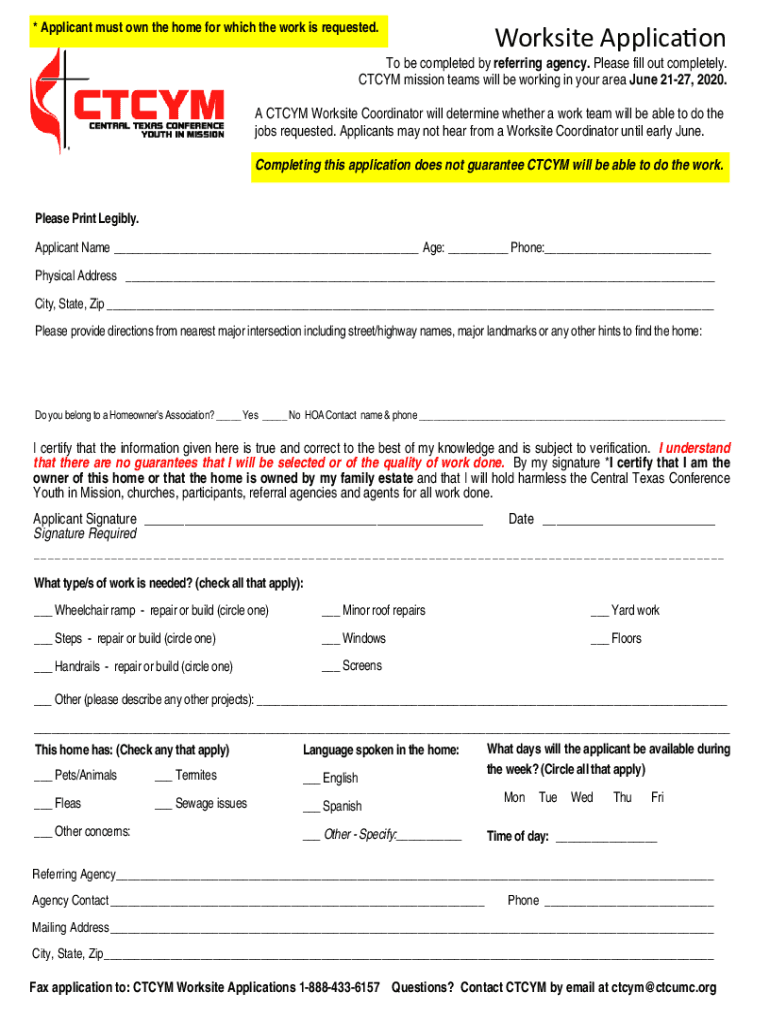 * Applicant must own the home for which the work is requested. WorksiteApplica onto be completed by referring agency. Please fill out completely. CT CYM mission teams will be working in your area