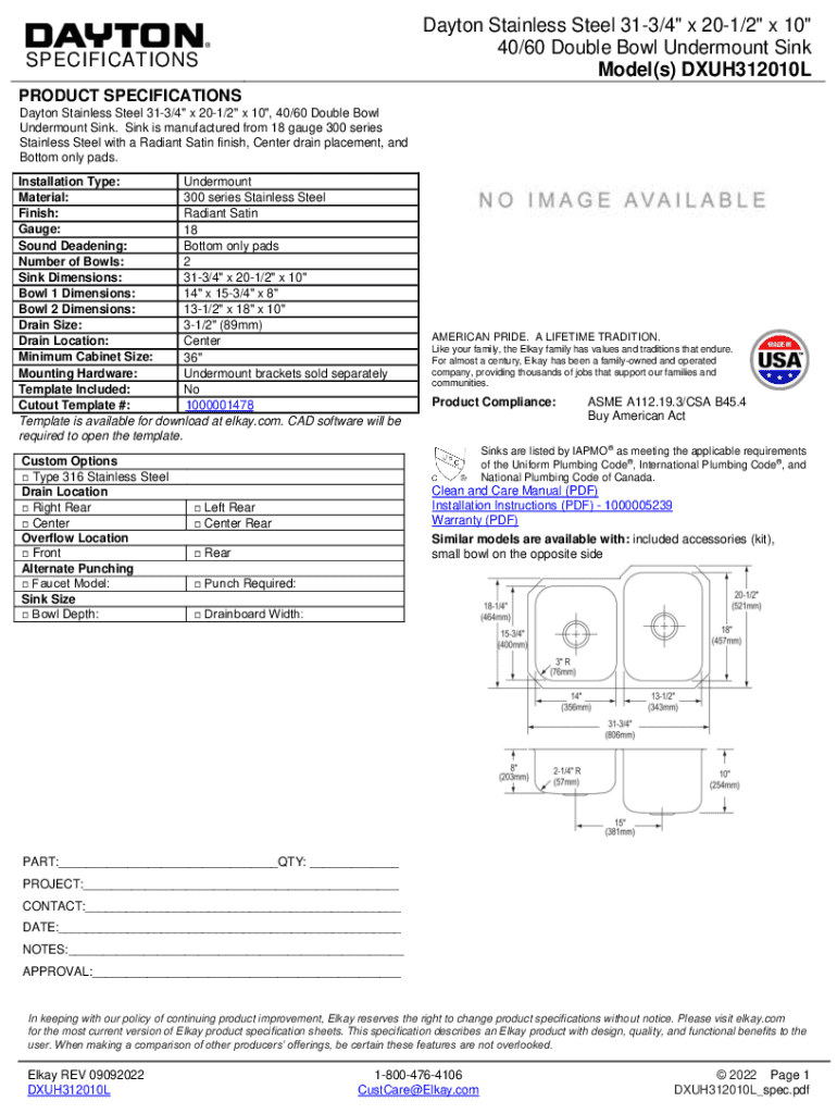 Dayton Stainless Steel 313/4\” x 201/2\” x 10\” 40/60 Double Bowl Under mount Sink Model(s) DXUH312010LSPECIFICATIONS PRODUCT SPECIFICATIONS Dayton Stainless Steel 313/4\” x 201/2\” x 10\”,