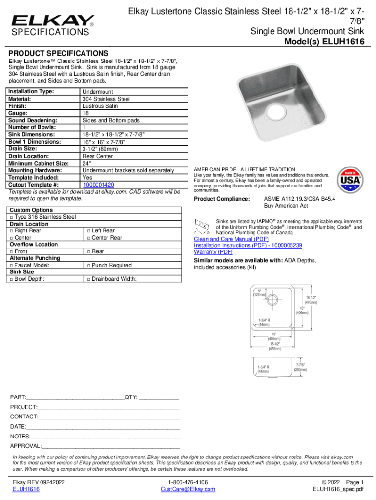 SPECIFICATIONSElkay Luster tone Classic Stainless Steel 181/2\” x 181/2\” x 77/8\” Single Bowl Under mount Sink Model(s) ELUH1616PRODUCT SPECIFICATIONS Elway Luster tone Classic Stainless Steel