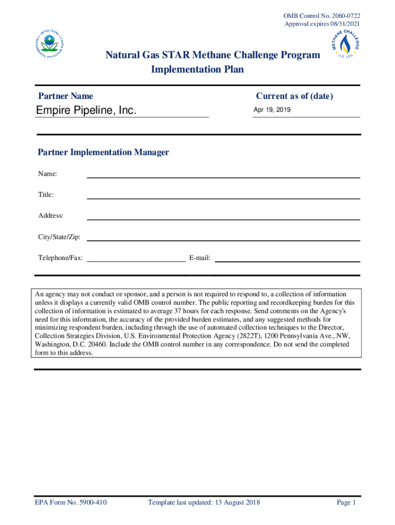 OMB Control No. 20600722 Approval expires 08/31/2021Natural Gas STAR Methane Challenge Program Implementation Plan Current as of (date)Partner NameEmpire Pipeline, Inc. Apr 19, 2019Partner Implementation