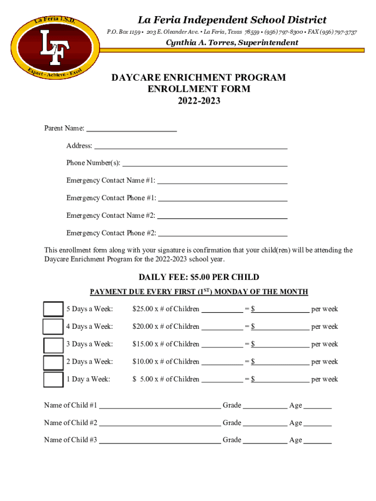 La Beria Independent School District P.O. Box 1159 203 E. Oleander Ave. La Beria, Texas 78559 (956) 7978300 FAX (956) 7973737Cynthia A. Torres, SuperintendentDAYCARE ENRICHMENT PROGRAM ENROLLMENT