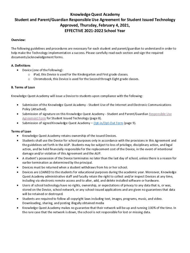 Knowledge Quest Academy Student and Parent/Guardian Responsible Use Agreement for Student Issued Technology Approved, Thursday, February 4, 2021, EFFECTIVE 20212022 School Year Overview: The following