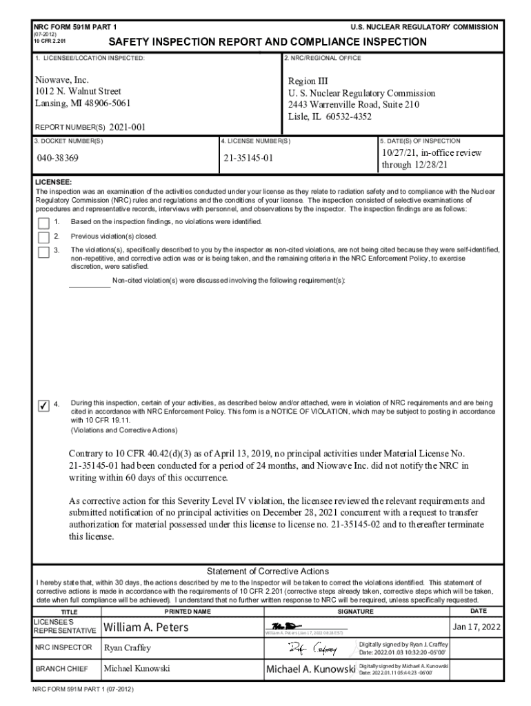 Get the free Niowave, Inc. - NRC Form 591M Part 1, Inspection Report ...