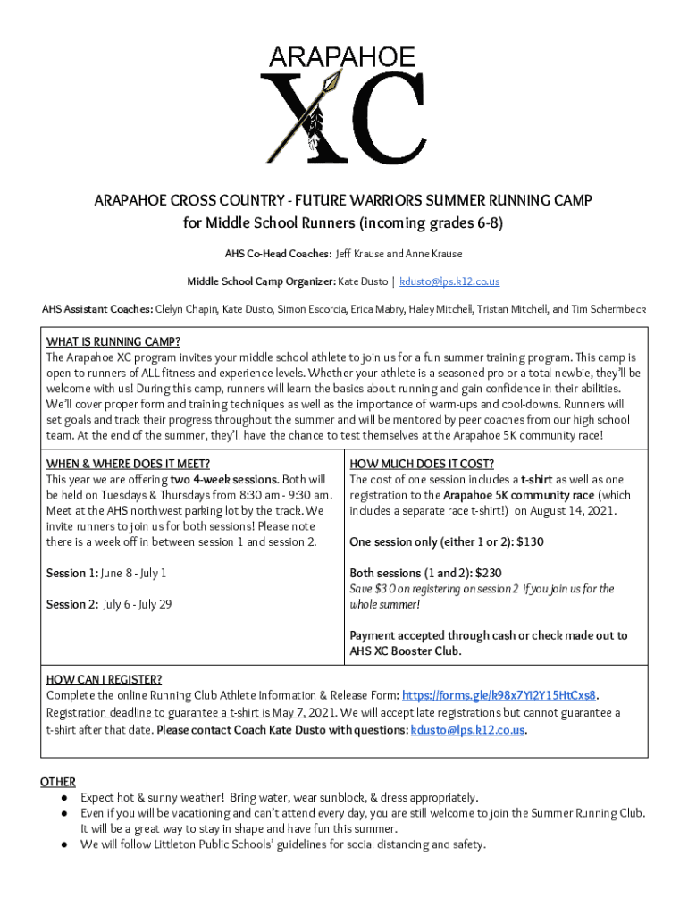 ARAPAHOE CROSS-COUNTRY FUTURE WARRIORS SUMMER RUNNING CAMP for Middle School Runners (incoming grades 68) AHS Colead Coaches: Jeff Krause and Anne Krause Middle School Camp Organizer: Kate Dust |